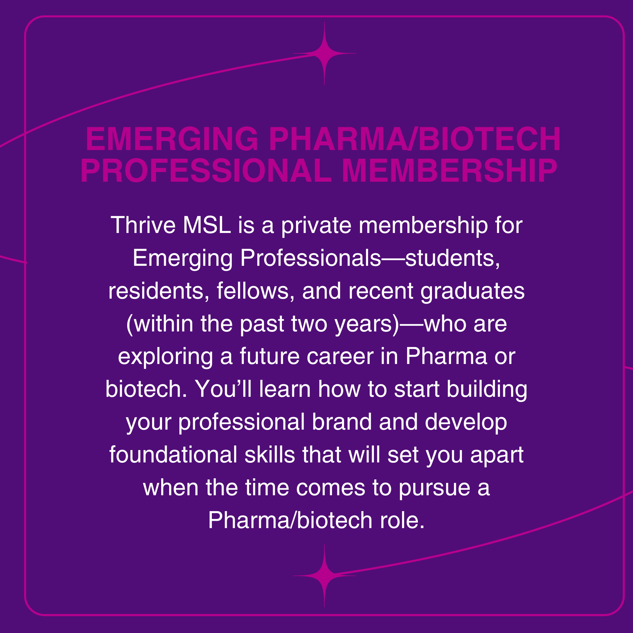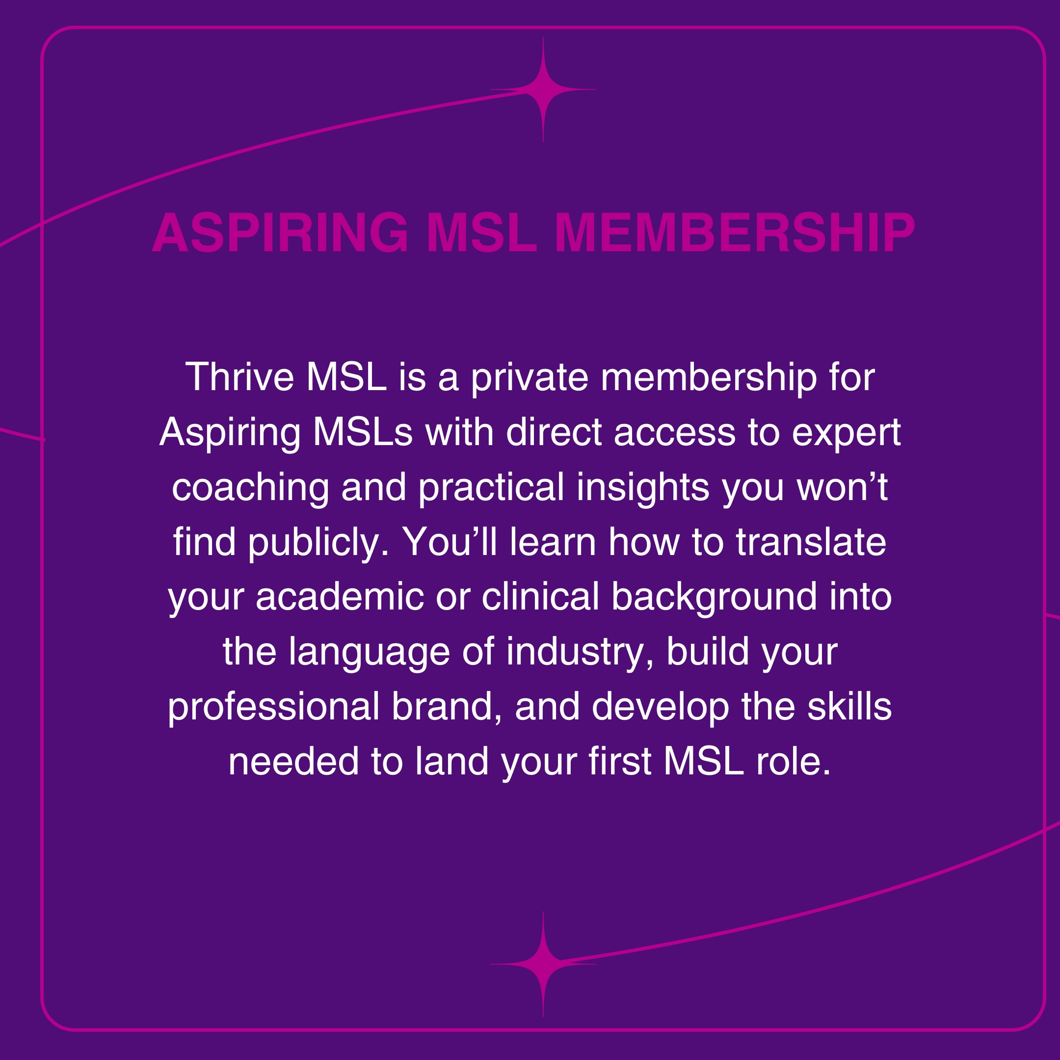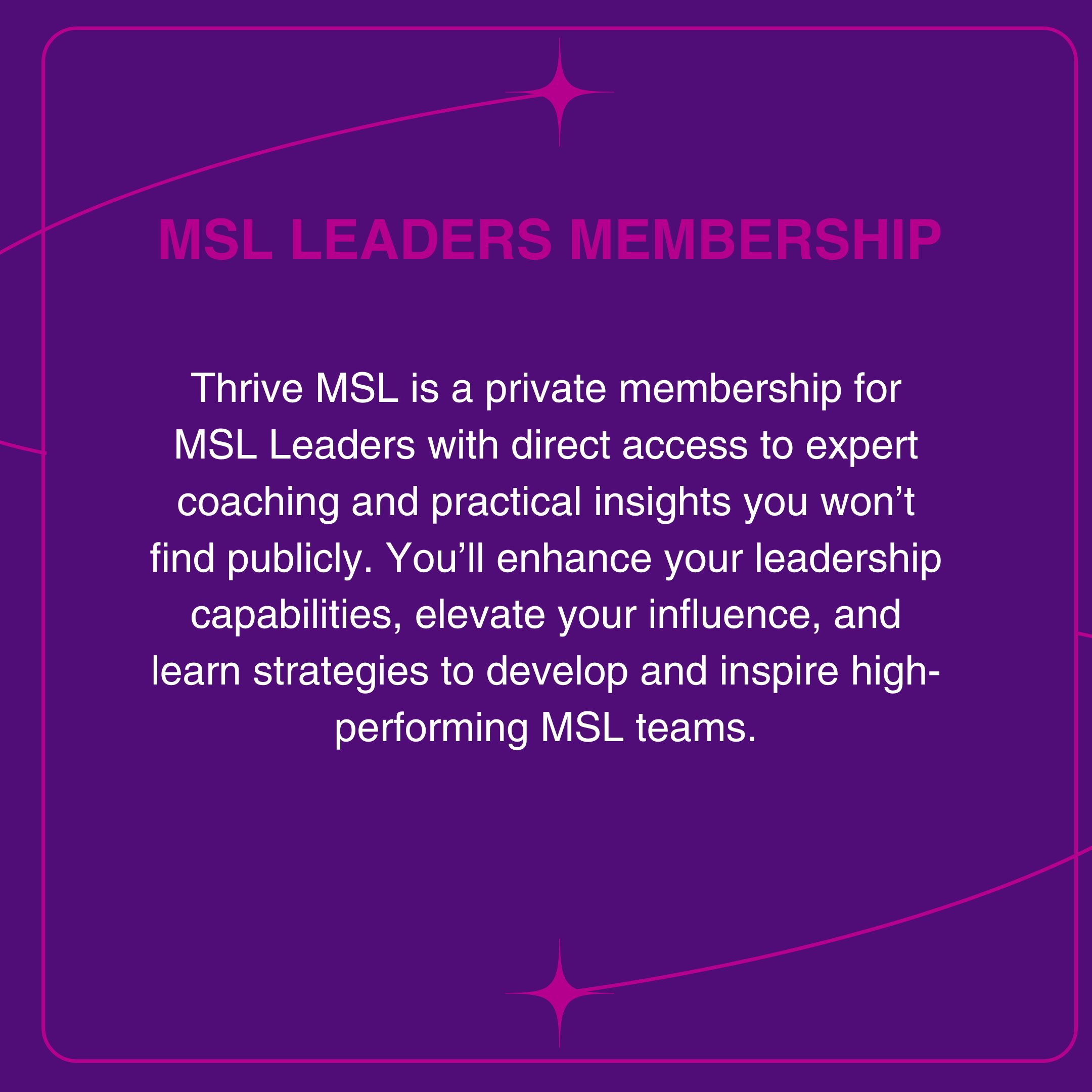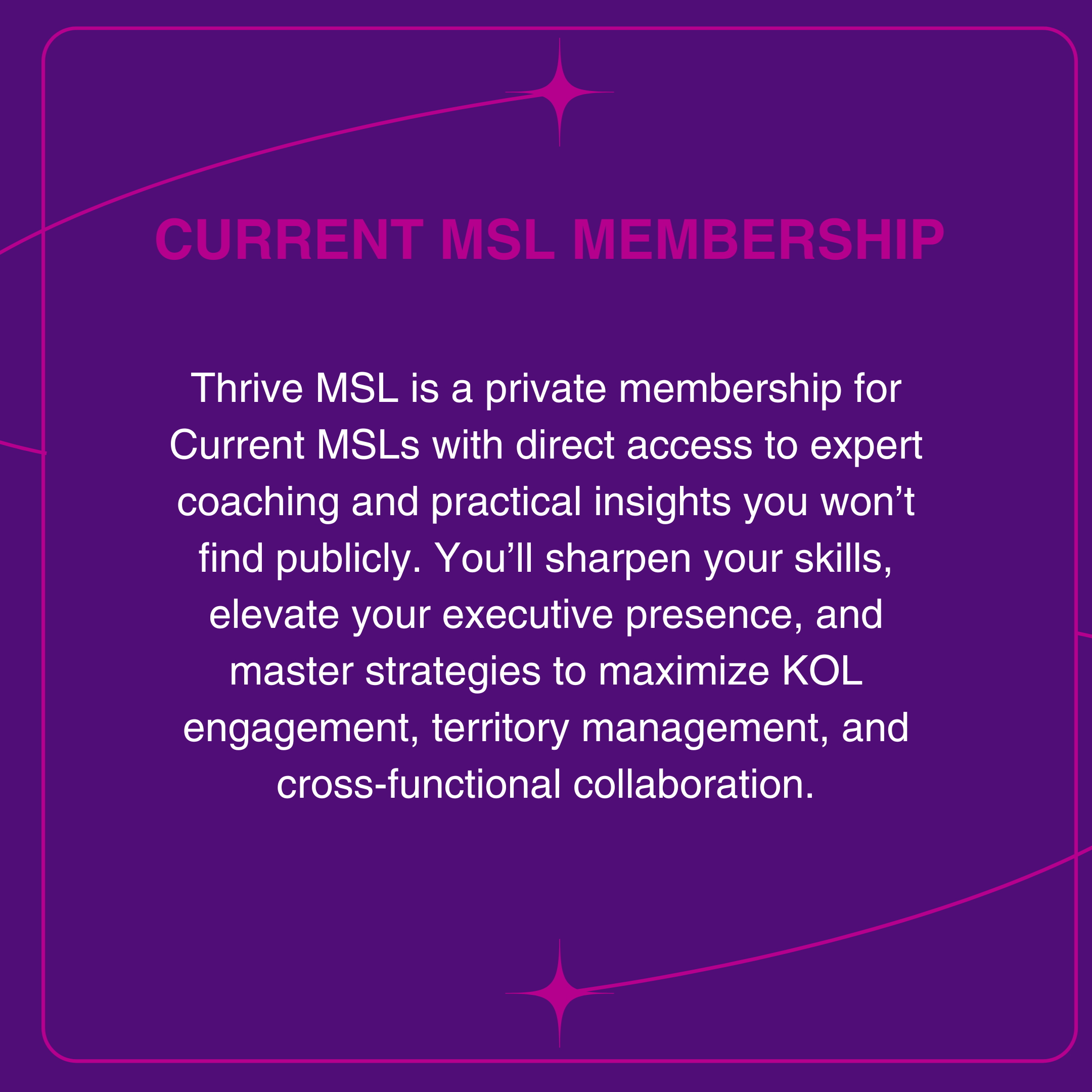 Thrive MSL Community is a private membership for Current MSLs, MSL leaders, Aspiring MSLs, and Emerging Pharma/Biotech Professionals with direct access to expert coaching and practical insights you won’t find publicly. You’ll enhance your skills, build your confidence, and thrive together through daily success strategies, weekly group coaching, 24/7 online resources, professional network, and a private group chat. Our goal is to empower and equip you to accelerate your career journey, build a valuable network, and thrive at work and at home.